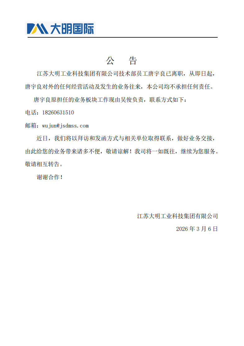 ¹ØÓÚÌÆÓîÁ¼µÄÀëÖ°¹«¸æ